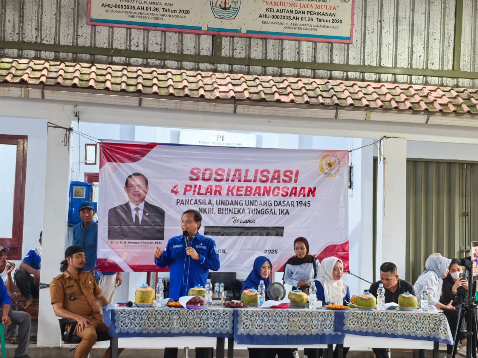 CIREBON – Anggota DPR-RI Komisi VI dari Partai Demokrat Herman Khaeron menggelar sosialiasi Empat Pilar Kebangsaan di kelompok petani nelayan Suraneggala, Kecamatan Kapetakan, Kabupaten Cirebon, Senin (15/12/2025).