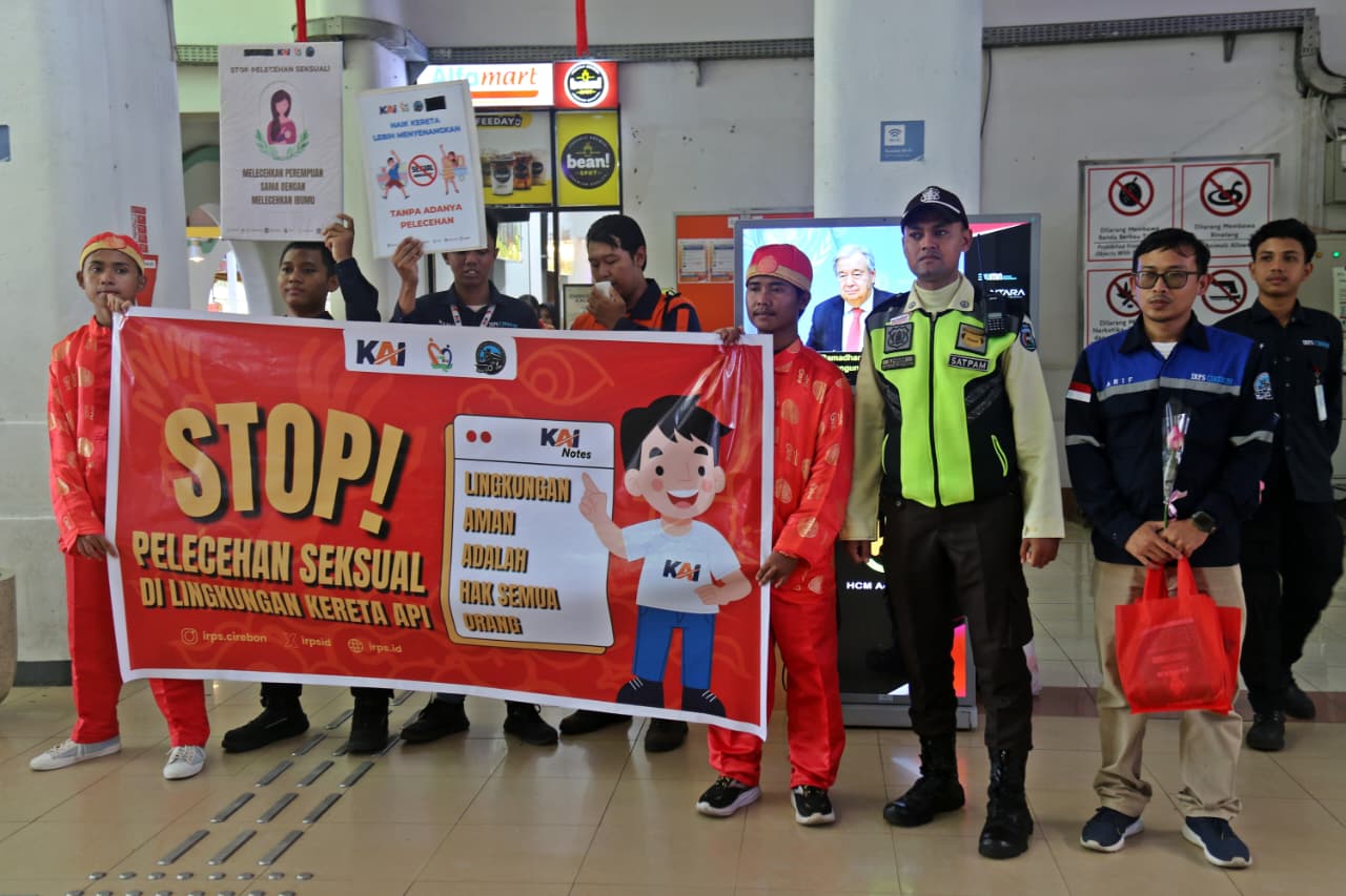 Selain sosialisasi keselamatan di perlintasan sebidang, KAI Daop 3 Cirebon juga berkolaborasi dengan Komunitas Pecinta Kereta Api IRPS Korwil Cirebon dalam menggelar kampanye anti pelecehan seksual di area Stasiun Cirebon dan diatas KA Cakrabuana relasi Cirebon-Gambir keberangkatan Selasa (17/02/2026) pukul 16.00 WIB.