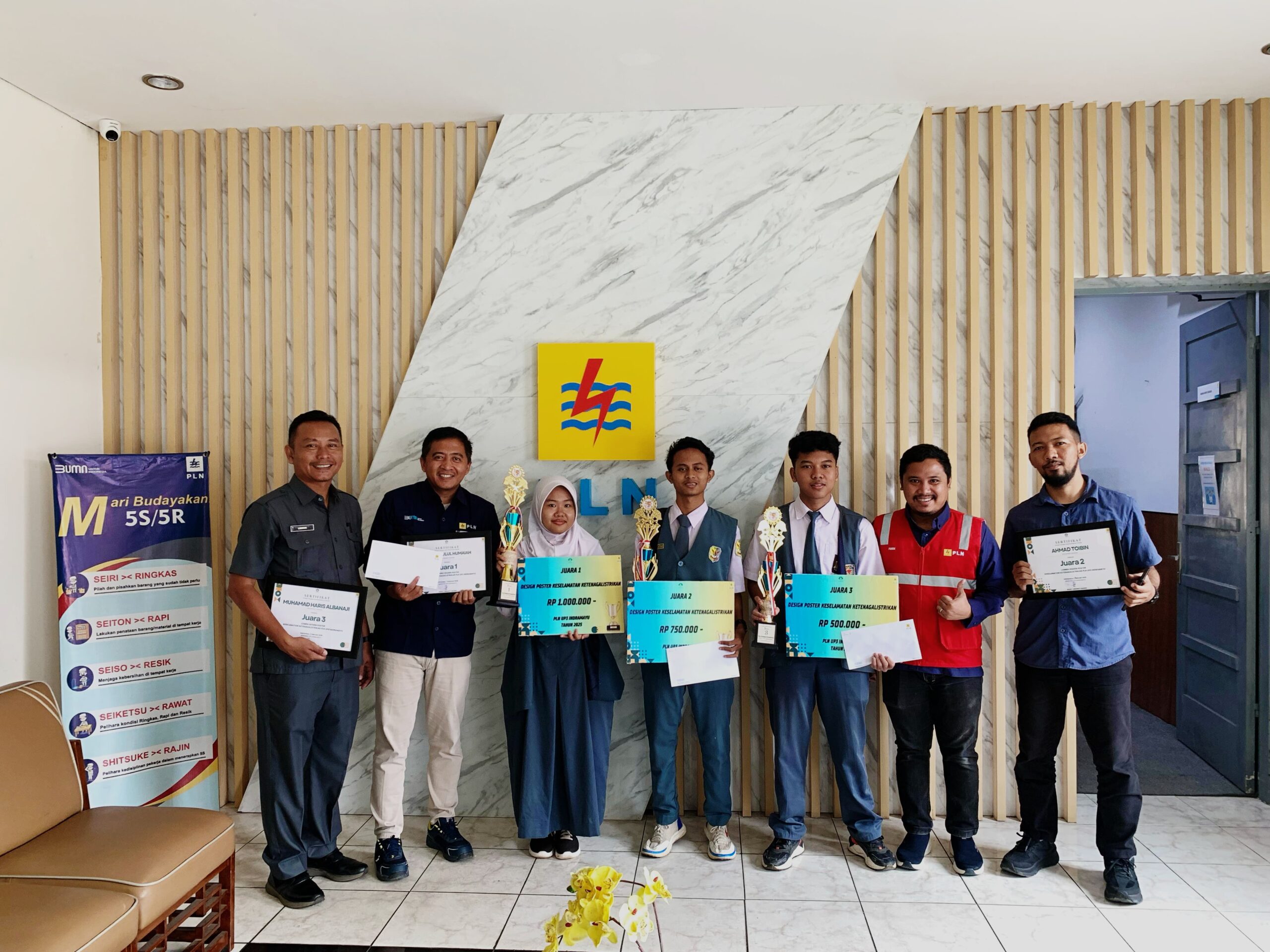 INDRAMAYU – Asisstant Manager Keuangan & Umum PT PLN (Persero) Unit Pelaksana Pelayanan Pelanggan (UP3) Indramayu, Asep Tri Wahyudi didampingi Team Leader, K3L dan Kam, M. Farda Najih Arifani menyerahkan sertifikat dan hadiah kepada pelajar SMA/SMK pemenang 1, 2 dan 3 lomba poster digital tema keselamatan listrik umum. Lomba poster digital tema keselamatan listrik umum ini berlangsung pada Januari 2025.