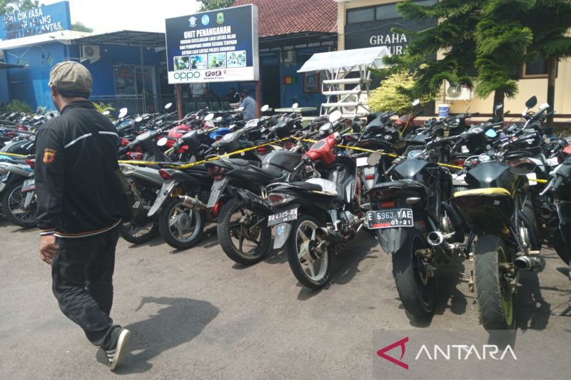 Sejumlah sepeda motor dengan knalpot bising atau brong yang diamankan Satlantas Polres Kuningan di Kuningan, Jawa Barat, Kamis (18/1/2024). (ANTARA/Fathnur Rohman)